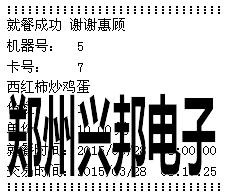 計(jì)算模式下按‘+’號鍵可進(jìn)行取餐,取餐時(shí)將需要取餐的卡放到刷卡區(qū),消費(fèi)機(jī)可自動(dòng)讀取卡片上的訂餐信息,并將其顯示出來,按‘+’號鍵可翻頁查看訂餐信息,按‘確認(rèn)’可進(jìn)行取餐,取餐成功后會(huì)顯示就餐成功、菜肴名稱、份數(shù)、扣費(fèi)金額,若連接的有打印機(jī),可打印取餐信息,打印的格式如下圖所示: